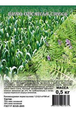 Вико-овсяная смесь (сидерат). Смесь из бобовой и злаковой культуры используется в качестве "зеленого удобрения". Обогащает почву азотом, фосфором и калием, препятствует вымыванию гумуса, хорошо рыхлит и структурирует землю, вытесняет сорняки. Хороший предшественник для культур, которым нужно много азота. Растения выдерживают заморозки до 5-7°C. Не требовательны к почве, хорошо переносит засуху и затенение.Рекомендуемая норма высева 1,5-2,0 кг/100м2.