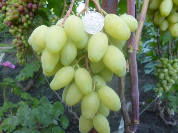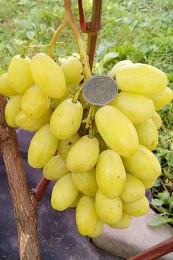 Кусты сильнорослые. Из достоинств выделяют очень хорошее вызревание лозы. Хорошо выдерживает нагрузку урожаем (по две грозди на побег). Ягоды крупные, весом до 14 г. Овально-удлиненные, сочные, мясистые, кожица съедаемая. Кисти рыхлые, крупные, массой более 600 г. Вкус сочетает ноты спелого банана с легкой кислинкой сока ананаса. Баланс сахара и кислоты отличный.