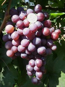 Виноград Герман. Раннесреднего срока созревания, созревает в конце августа. Сила роста кустов большая. Сорт проявляется крупными ягодами, они целостные, очень однородные с фиолетовым оттенком, плотно расположены на грозди, которая может достигать массы в 1,5 кг и более. Мякоть хрустящая, вкус ягод гармонично сочетает в себе сладость и кислинку, с небольшим оттенком терпкости. Сорт имеет приятный виноградный аромат.