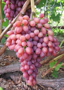Цветок обоеполый. Грозди крупные до 35-45 см, массой 450-650 г, расширенные на концах, цилиндрической и конической формы, рыхлые или средней плотности. Ягоды средне-крупные, массой 4-5 г, удлиненной овальной формы, красновато-розового цвета. Мякоть мясистая, плотная, сочная, со сладким вкусом, легкой кислинкой и тонким мускатным ароматом.