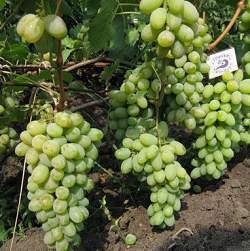 Лист средний, пятилопастный, серовато-зеленый. Гроздь средняя и крупная, 350-500 г, коническая, часто с крылом, не очень плотная. Ягоды крупные, овальные, белые, на солнце розовато-янтарные, 22-23 мм, 4-5 г. Мякоть мясисто-сочная, хрустящая, приятного вкуса, с тонким мускатным ароматом. Сахаристость 16-18%, кислотность 7-8 г/л.