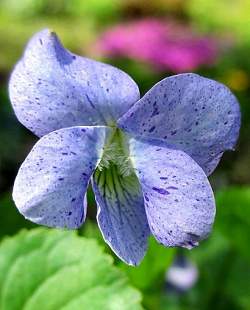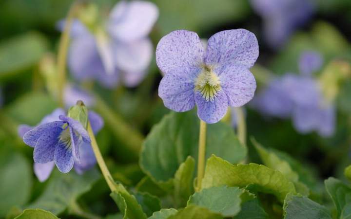 Виола сестринская Dark Freckles (Дарк Фреклс). Листики сердцевидные, цветки голубые с темно-синими точками и штрихами (потому фиалка и называется в переводе с английского "Темные Веснушки"). Цветение обильное и продолжительное в мае-июне. Обаятельное растение для переднего плана любых типов цветников.