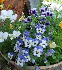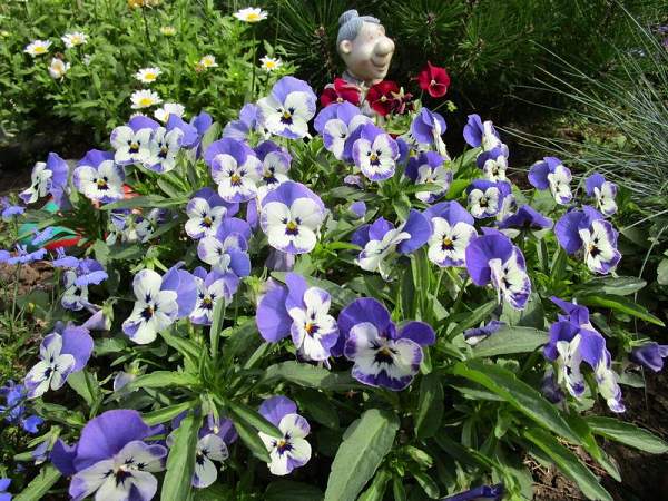 Виола рогатая Гжель. За необыкновенную бело-голубую расцветку гибрид получил золотую медаль международной выставки Fleuroselect. Относится к очень популярной среди профессиональных озеленителей серии "F1 Сорбет". Формирует компактный аккуратный кустик, усыпанный довольно крупными для рогатой виолы цветками (3,0-4,5 см).