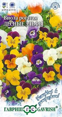 Виола Лесные эльфы рогатая DH. Многолетнее растение, образующее компактные кустики высотой до 20 см, усыпанные миниатюрными цветками различных оттенков. Благодаря достаточно мелким размерам цветка (диаметр 1,5-3,5 см) и обильному цветению (одновременно на кустике распускается до 60 цветков) растение идеально подходит для создания цветочного ковра. Размножается семенами и делением куста. От посева до начала цветения проходит 10-13 недель. Рост начинается при 6-8°С, оптимальная температура для развития растений 16-18°С, однако переносит кратковременные заморозки. Предпочитает легкую почву. Цветет с мая по сентябрь. При длительном выращивании наблюдается обильный самосев. Семена можно высевать ранней весной и осенью, предпочтительнее с 10 августа по 10 сентября. При весеннем посеве семена необходимо стратифицировать при температуре +10оС. После укоренения листовые розетки обрезают, удаляя цветоносы. Виола рогатая предпочитает умеренные температуры, поэтому ее рекомендуется высаживать в полутени, либо в комбинации с более высокими растениями, защищающими от перегрева. Отлично смотрится на полутенистой альпийской горке. Используют также как выгоночную горшечную культуру.