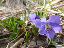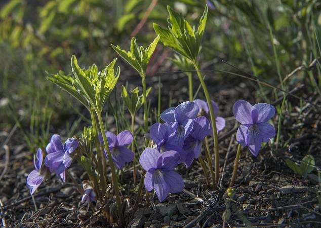 Виола пальчатая. Растёт в сосновых, сосново-берёзовых лесах. Цветёт в конце мая — начале июня, плодоносит в июле. Многолетнее травянистое короткокорневищное бесстебельное растение. Листья прикорневые, до 25 см дл., пластинки пальчато 5-рассечённые. Сегменты от эллиптических до широколанцетных, крупнозубчатые, опушённые. Прилистники ланцетные, плёнчатые.