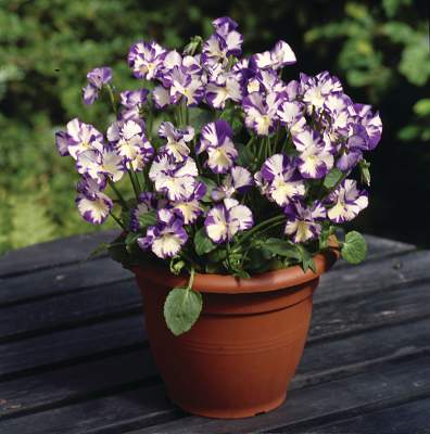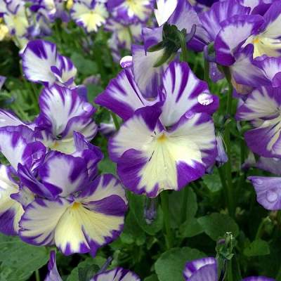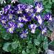Виола рогатая Rebecca (Ребекка). Цветки желтоватые с выразительной перистой каймой синего цвета. Цветет с апреля до морозов с небольшим перерывом летом. Многолетнее растение высотой около 15 см, ценится за обильное и долгое цветение. Разрастаясь, фиалки образуют пышные куртинки или коврики из небольших округлых листьев и множества цветов.