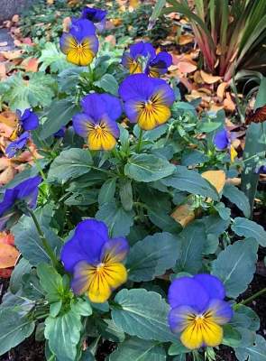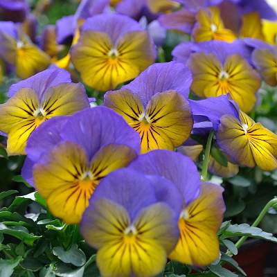 Виола рогатая Sorbet Xp Morfo (Сорбэ Морфо). Цветки двухцветные, верхние — сиреневые, нижние желтые с пурпуно-коричневыми жилками. Довольно крупные для фиалки рогатой, около 4 см в диаметре. Многолетник цветет с апреля до морозов, чрезвычайно обильно. Растение высотой около 15 см, ценится за обильное и долгое цветение. Разрастаясь, фиалки образуют пышные куртины или коврики из небольших округлых листьев и множества цветов.