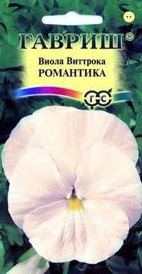 Виола Романтика Виттрока (Анютины глазки). Неприхотливое двулетнее растение из семейства Фиалковые высотой до 20 см. Цветет обильно и продолжительно с мая по сентябрь. Цветки крупные, до 6-7 см в диаметре, бархатистые, нежно-кремовые с желтым глазком. Влаголюбива, холодостойка, хорошо растет на солнце и в полутени. Для получения растений, цветущих в год посева, семена высевают на рассаду в феврале-марте. Всходы появляются через 5-7 дней. В открытый грунт рассаду высаживают в конце апреля-начале мая на расстоянии 10-15 см. Растения хорошо переносят пересадку в цветущем состоянии. При посеве в открытый грунт в июне-июле, цветение наступает во второй год. Используют для посадки на клумбы, рабатки, в балконные ящики и садовые вазы.