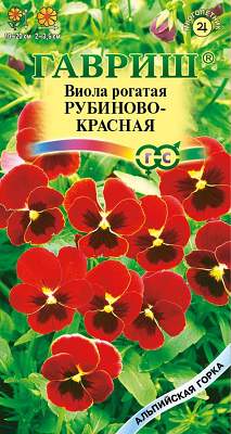 Виола Рубиново-красная рогатая. Многолетнее растение, образующее компактный кустик высотой 10-20 см. Размножается семенами и делением куста. От посева до начала цветения проходит 10-13 недель. Рост начинается при 6-8°С, оптимальная температура для развития растений 16-18°С, однако переносит кратковременные заморозки.