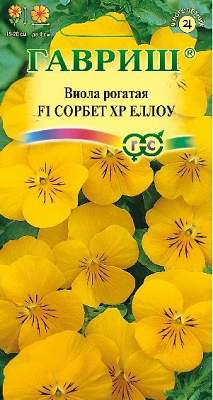 Виола Сорбет XP Еллоу F1 рогатая (Анютины глазки). Компактный кустик высотой 15-20 см, диаметром 15-20 см. Цветки желтые, диаметром 4 см, с выраженными штрихами в центре. Обильно цветет. Хорошо растет на солнце и в полутени. Для посадки на клумбы, в рабатки, балконные ящики и садовые вазы.