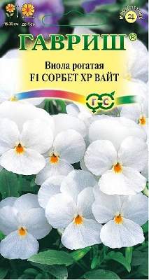 Виола Сорбет XP Вайт F1 рогатая (Анютины глазки). Компактный кустик высотой 15-20 см, диаметром 15-20 см. Цветки белые, диаметром 4 см. Обильно цветет. Хорошо растет на солнце и в полутени. Для посадки на клумбы, в рабатки, балконные ящики и садовые вазы.