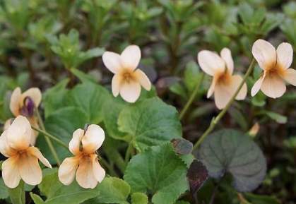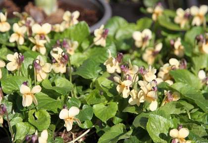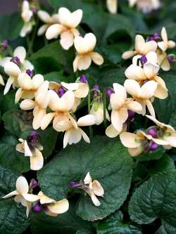 Виола Sulfurea (Сульфуреа). Взрослое растение представляет собой компактную куртину, состоящую из плотных темно-зеленых листьев. В середине весны появляются тонкие цветоносы с фиолетовыми бутонами. Раскрываясь, лепестки цветов приобретают кремовую окраску.