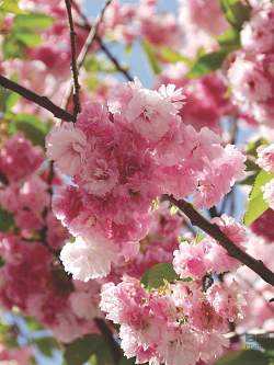 Вишня Pink Perfection (Пинк Перфекшн). Листопадный крупный кустарник или небольшое дерево. Крона вертикальная, воронковидная. Сорт скорорастущий, годовой прирост около 30 см, достигает высоты 8 м. Габитус приподнятый, свободный. Для придания молодым деревьям соответствующей формы, требуется подрезка (укорачивание) тонких приростов. Листья расположены поочерёдно, остро-эллиптические, длиной 8-10 см, края дважды зубчатые. Молодые листья слегка коричневые, по мере роста становятся темно-зелеными. К осени приобретают оранжево-красную окраску. Цветки двойные, собраны в кисти, интенсивно розового, а даже слегка пурпурного цвета. Сорт поздний, зацветает в конце апреля — начале мая.
