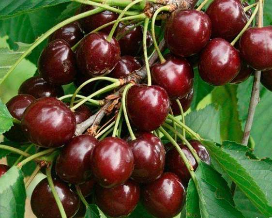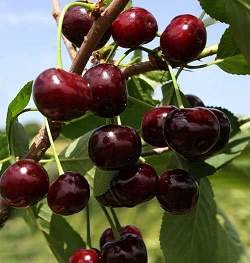 Вишня Жуковская. Дерево среднерослое с округлой, раскидистой кроной. Плодоношение сосредоточено на букетных веточках, частично плодоносит на прошлогодних приростах. Плоды 4-6 г темно-красного цвета, привлекательного внешнего вида. Форма плода овально-сердцевидная.