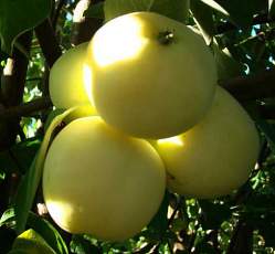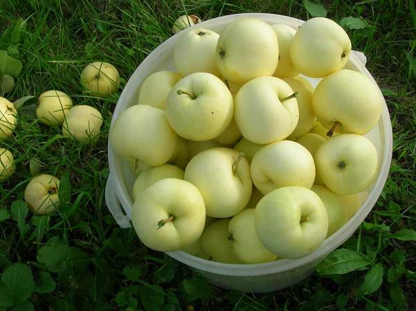 Яблоня Белый Налив. Широко распространенный сорт народной селекции с плодами раннелетнего созревания. Дерево средних размеров, с широкопирамидальной кроной в молодом возрасте, которая постепенно становится округлой. Окраска плодов без румянца, зеленовато-желтая, в фазе съемной зрелости покрыта беловатым налетом. Кожица тонкая. Мякоть плодов белая, рыхлая, нежная, крупнозернистая, достаточно сочная.