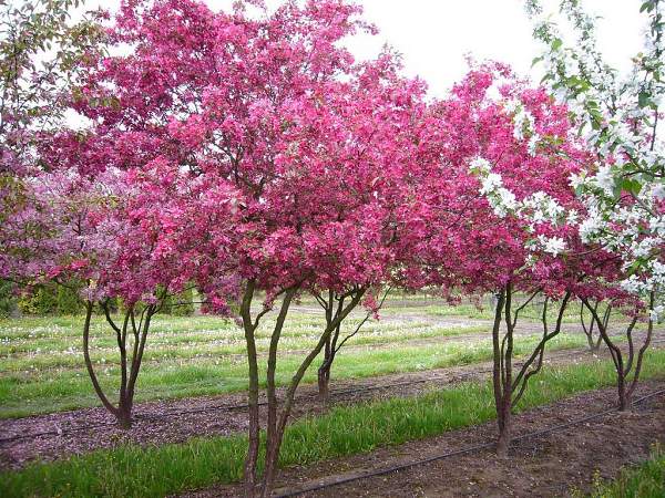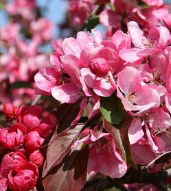 Яблоня декоративная Rudolph (Рудольф). Крупный кустарник или деревце высотой 3-6 м и шириной 4-5 м. Крона широкая вертикальная. Листья при распускании коричнево-красные, летом тёмно-зелёные с коричневым блеском.