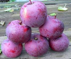Плоды среднего размера, уплощенно-округлые или округло-конические, слаборебристые к вершине. Основная окраска светло-желтая, покровная занимает почти всю поверхность плода – интенсивный бордово-красный румянец. Сильный сизый восковой налет придает плодам вид фиолетовых. Мякоть белая, плотная, сочная, сладкая, без кислого привкуса, ароматная, хорошего вкуса.