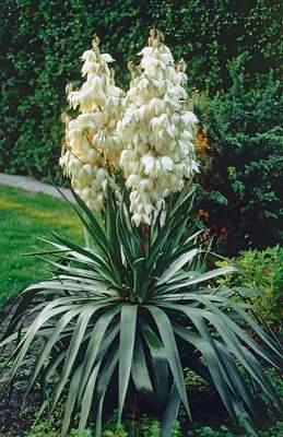 Юкка нитчатая — бесстебельный вечнозеленый многолетник, цветоносы которого достигают в высоту 1,8 м. Правда, в нашей зоне они пониже — до полутора метров. Белые, довольно крупные колокольчатые цветки юкки, собранные в узкометельчатое соцветие, по вечерам издают приятный аромат.