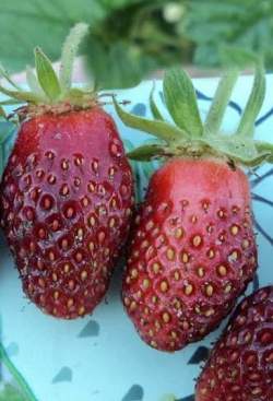 Ягоды каплевидные, первые массой 20-30 г, остальные мельче, карминно-красного цвета с лёгким муаром. Мякоть умеренно плотная, розовая, с отменным медовым вкусом и насыщенным землянично-мускатным ароматом. Не боится суровых зим, засухи и жары. Замечательно растет в полутени. Сорт не восприимчив к мучнистой росе и всем видам гнилей. Пригоден в любую переработку, заморозку и сушку.