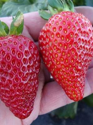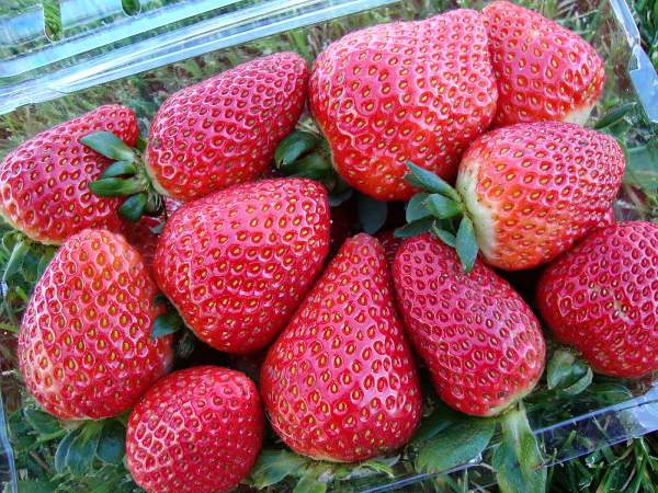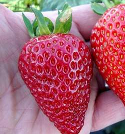 Земляника Альбион. Ягоды крупные, конические, тёмно-красные внутри и снаружи, блестящие, хорошо созревают до самого кончика, очень высокого качества. Этот сорт имеет уникальный ярко-выраженный аромат и очень интенсивный сладкий вкус.