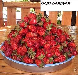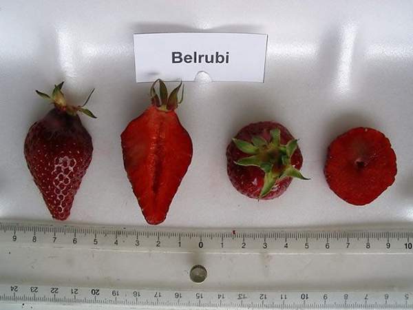 Земляника Белруби. Среднего срока созревания. Куст высокорослый, прямостоячий, компактный. Цветоносы высокие. Соцветия раскидистые, многоцветковые, расположены на уровне листьев. Ягоды крупные, форма ягоды узко-коническая, с хорошо выраженной шейкой. Кожица тёмно-красная, блестящая. Семянки расположены поверхностно. Мякоть светло-красная, очень плотная. Вкус очень хороший.