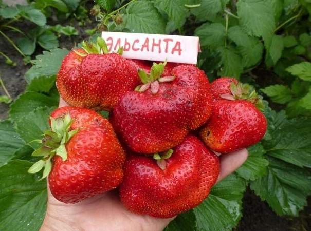 Земляника Эльсанта (Elsanta). Получен от скрещивания сорта "Valeta" с cортом "Arking". Ягоды ширококонической формы с плотной мякотью, тёмно-красные до 25 грамм. Плоды сладкие с приятной кислинкой употребляются как в свежем виде, так и в замороженном. Сорт зимостоек, устойчив к белой, бурой и угловатой видам пятнистости. Сравнительно устойчив к нематоде и земляничному клещу.