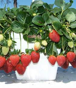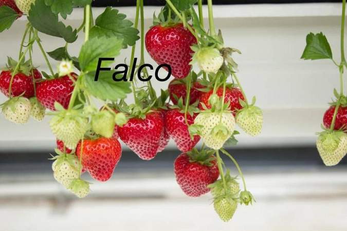 Земляника Фалко. Относится к сортам среднераннего срока созревания, десертного назначения. Кусты прямые, сильно облиственные, средней высоты. Листья крупные, зеленого цвета, вогнутой формы, ребристые и морщинистые. На каждом растении формируется 3-5 мощных цветоносов, расположенных на уровне листьев.
