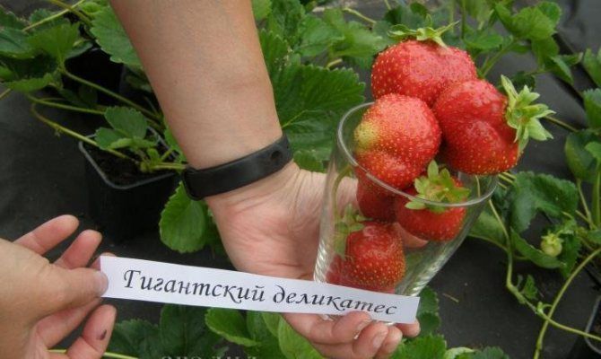 Земляника Гигантский Деликатес. Отличается гигантскими размерами и сладким вкусом ягод, устойчивостью к перепадам температур и погодным условиям. Срок созревания средне-ранний. Размер ягод до 100 г. Урожайность до 2 кг с куста. Сорт годится для выращивания в открытом и защищенном грунте.