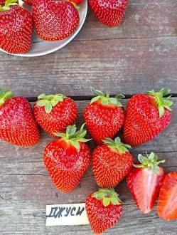 Земляника Giusy (Джуси). Новый сорт итальянской селекции CIV (Консорциум итальянских питомников). Ягоды очень крупные и сладкие, вкус замечательный, гармоничный. Ягода весит в среднем от 25 г до 50 г. Причем вид и вес ягод не меняется в течение сезона. Качество ягод относится к классу А. Мякоть достаточно мягкая и обладает замечательными вкусовыми качествами. Вкус плодов насыщенный с характерной клубнично-земляничной ноткой.