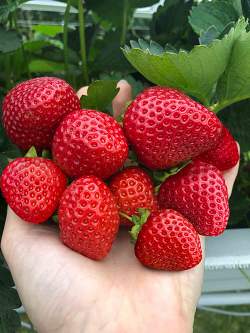 Земляника Хадемар. Ремонтантный голландский сорт. Кусты высокие и мощные, но компактные. Листья крупные, цветоносы длинные, полегающие. Ягоды яркого насыщенного цвета, глянцевые, форма безупречная, точёная. Мякоть плотная, при этом нежная и сочная. Вкус замечательный, сладкий, без терпкости, с медовой сладостью и прекрасным ароматом.