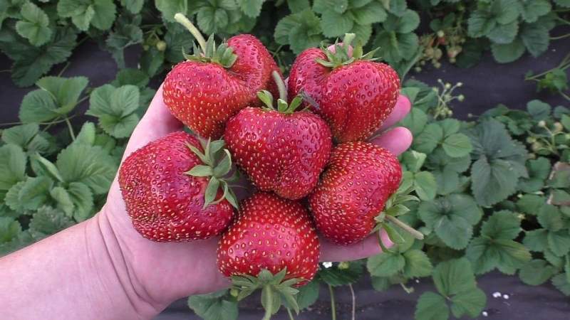 Земляника Кисс Неллис. Сорт редкий. Плоды сверхкрупные, очень вкусные, прекрасно хранятся. Ягоды весом 60 г (отдельные до 120 г), темно-вишневые, конусовидные, красивые. Мякоть плотная, сочная. Чем больше солнца, тем слаще. Цветоносы мощные. Кусты густые, раскидистые. Усов мало. Срок созревания средне-ранний.