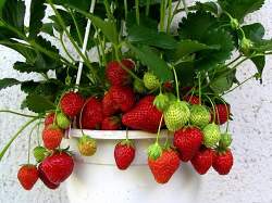 Клубника в подвесном кашпо (смесь ремонтантных сортов) — великолепное украшение для балкона, веранды, беседки. Ягоды всегда чистые, их можно срывать и есть, просто протянув руку. Цвести и плодоносить будет долго, радуя детей и гостей дачи! Кашпо белого цвета.