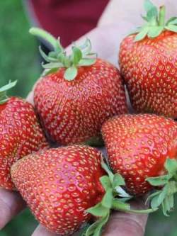 Земляника Ламбада. Ранний срок созревания. Сорт хорошо переносит загущенные посадки, сильнорослый, куст довольно открытый. Форма ягод коническая, слегка удлиненная, ягоды очень крупные, однородные, ярко-красной окраски, мякоть светло-красная, средней плотности. Плоды имеют ярко-выраженный земляничный аромат и нежную консистенцию.