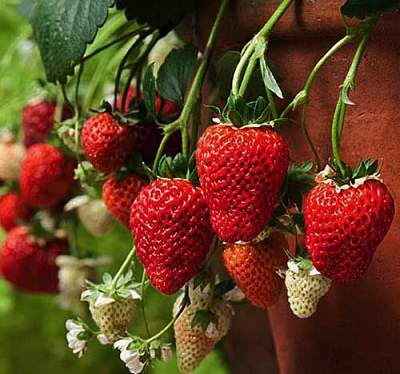 Ягоды конической формы, ярко-красные, крупные, весом до 30 гр. Мякоть плотная сочная, очень сладкая, с сильным мускатным ароматом. Растения устойчивы к пониженной освещенности. Хорошо подходит для контейнерного выращивания и подвесных кашпо. Формируют компактный куст. Гибрид отличает небольшое усообразование. Плодоносит с середины июня и до заморозков.