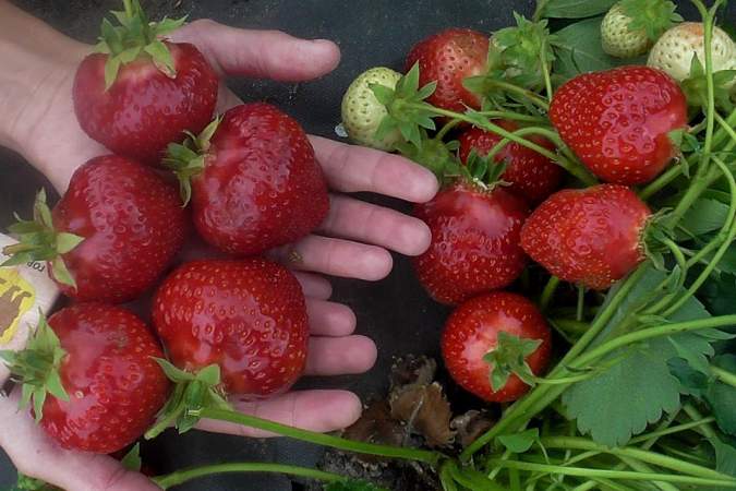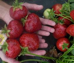 Земляника Верона. Ремонтантная. Растет очень быстро и обладает высокой продуктивностью. Ягоды крупные, конической формы. Цвет насыщенно-красный. Во вкусе есть тона персика и абрикоса. Средняя масса плодов 60-80 г. Бывают ягоды и до 100 г. С куста собирают до 800 г.