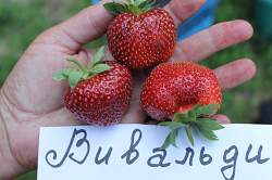 Земляника Вивальди. Среднего срока созревания. Ягоды блестящие, ярко-красные, сочные, ароматные, сладкие, конической формы.