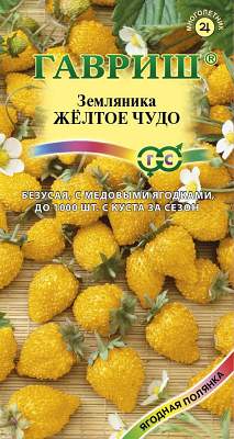 Земляника Желтое чудо. Уникальный сорт зимостойкой земляники, не образует усов, непрерывно плодоносит весь сезон. При регулярной подкормке и поливе дает до 1000 ягод с куста. Ягоды светло-желтые, по вкусу и аромату превосходят все красноплодные сорта. Устойчив к вредителям и болезням, ягоды не склевываются птицами (из-за цвета).Можно выращивать как горшечную культуру в домашних условиях или на балконе, тогда плодоношение продожается весь год.Посев земляники производят в марте-апреле. Семена смешивают с песком и равномерно распределяют по увлажненной ровной поверхности. Всходы появляются в течение 30 дней. В фазе 1-2 настоящих листьев саженцы пикируют в горшочки. После появления 6 настоящих листьев высаживают в грунт с расстоянием между рядами 25-30 см, между растениями 15-20 см. Сбор урожая начинают с июля.