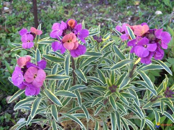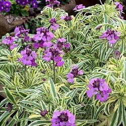 Желтушник льнолистный Variegatum (Вариегатум). Сиреневые четырёхлепестковые цветы с приятным ароматом образуются на желтушнике весной или в начале лета. Стебли растения густо покрыты листьями, которые окаймлены золотистой полоской. Они так красивы, что даже нецветущие экземпляры выглядят привлекательно.