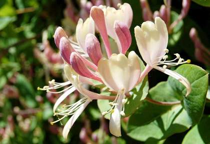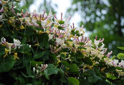 Жимолость каприфоль (Lonicera caprifolium). Вьющийся кустарник с побегами, достигающими трехметровой длины. Листья эллиптические, до 10 см длиной, сверху темно-зеленые, снизу сизоватые. Цветки от беловатых до темно-розовых и желтых. Плоды оранжево-красные. Цветет в начале лета. Неприхотлива, зимостойка.