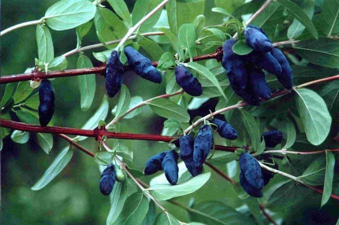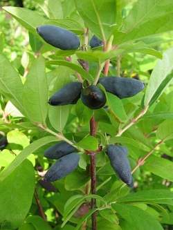 Жимолость Лазурная. Относится к среднеспелым сортам этого растения. Благодаря приятному вкусу и устойчивости к осыпанию она относится к наиболее популярным разновидностям жимолости. Жимолость Лазурная относится к сортам сибирской селекции. Кусты этого сорта считаются среднерослыми, так как могут достигать высоты 1,7 м. Это, как правило, среднераскидистые растения с обратноконической кроной, состоящей из тонких не опушенных побегов светло-зеленого цвета. Во время активного роста и при обилии солнца они могут окрашиваться в розоватый цвет.