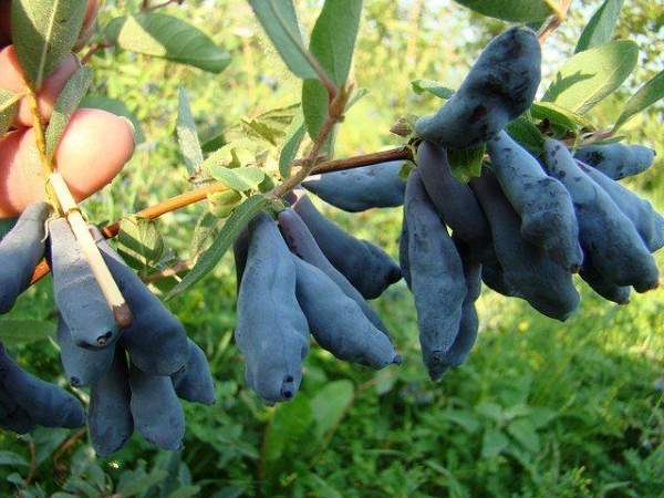 Жимолость Ленинградский Великан. Ягоды крупные, цилиндрической или узкоовальной формы, часто вздутые с верху, синего цвета, покрытые восковым налетом; сладкие и очень ароматные. Сорт созревает в половине июня, отличается слабой тенденцией к осыпанию. Плодоношение обильное. Урожай ягод с куста — от 2,5 до 5 кг.