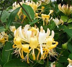 Жимолость приморская Graham Thomas (Грэхэм Томас). Красивая лиана, цветущая в июне. Неприхотлива, зимостойка. устойчива к засухе. Высота до 4 м. Быстро нарастает, отлично подходит для декорирования заборов, беседок.