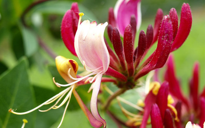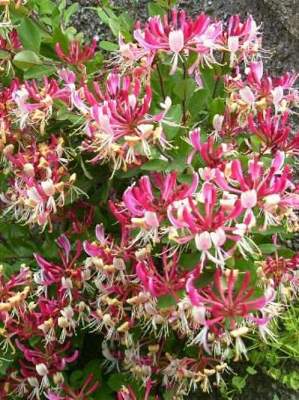 Жимолость вьющаяся Serotina (Серотина). Популярная лиана с декоративными двухцветными трубчатыми ароматными цветками: фиолетово-красные снаружи и кремовые внутри. Цветы распускаются с июня по сентябрь. Плоды декоративные, ярко-красные, июль-октябрь.