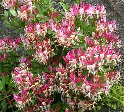 Высокий вьющийся кустарник до 6 м высотой. Листья сверху темно-зеленые и сизоватых снизу. Цветки в густых головчатых соцветиях, желто-белые внутри, снаружи с карминовым венчиком, очень душистые. Цветение начинается в июле и иногда продолжается вплоть до сентября. Темно-красные плоды созревают с августа.