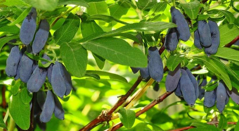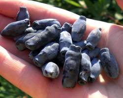 Жимолость Синий Утес. Среднеранний сорт. Куст сдержанного роста, овальный. Плоды крупные, массой 1,6-2,6 г, удлинённо-каплевидные, тёмно-фиолетовые с сильным восковым налётом, гладкие, созревают дружно в середине июня, не осыпаются. Мякоть плотная. Кожица средней толщины. Вкус кисло-сладкий, десертный, с приятным ароматом. Дегустационная оценка 4,9 балла. Транспортабельность хорошая. Назначение универсальное.