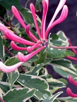Жимолость Variegata (Вариегата). Листья 8- 10 см длиной, характерной двухцветной или пестрой окраски. Цветет красновато-пурпурными цветочками, которые собраны в колосовидное или головчатое соцветие. Цветочки в серединке желтоватого окраса. Цветение ароматное и обильное.