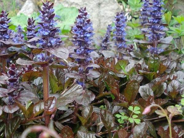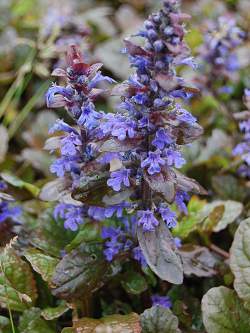 Живучка ползучая Braunherz (Браунхерц). Листья блестящие, яркие, коричнево-пурпурные с бронзовым отливом; цветки синие; высотой до 10-15 см; цветет в мае-июне.