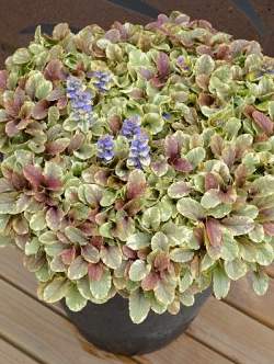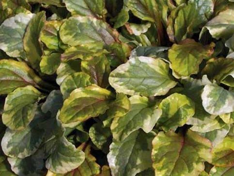 Живучка Golden Glow (Голден Глоу). Почвопокровное растение с вечнозелеными округлыми листьями. У данного сорта они сизоватые, со сливочно-желтой, довольно широкой неровной каймой. В мае-июне над ковриком живучки возвышаются свечеобразные соцветия из голубых цветков. Требует солнечного месторасположения и хорошего дренажа.