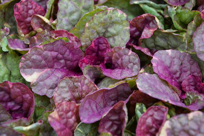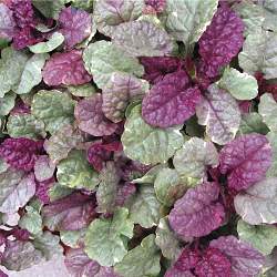 Живучка ползучая Sugar Plum (Шуга Плам). Цветки светло-фиолетовые, собраны в колосовидные соцветия. Листья пестрые зеленые с кремово-белым и лиловым. Молодые листья ярко-лиловые. Неприхотливое растение. Любит легкое затенение. Покров из живучки низкий, довольно плотный и долгоживущий. Листья зимующие, вне зависимости от сортовых признаков. Замена листьев происходит в течение весны следующего года, процесс постоянный, и поэтому малозаметный.