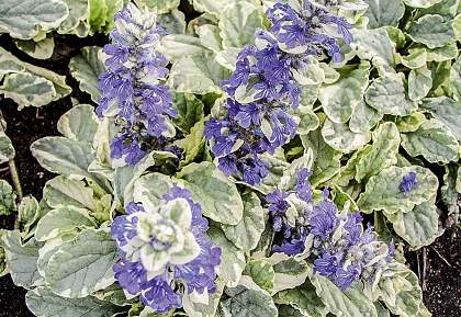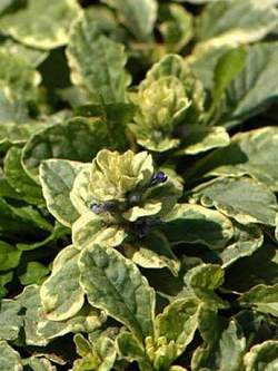 Живучка Variegata (Вариегата). Цветет в мае-июне, цветы голубовато-синие. Листья серовато-серебристо-зеленые имеют неравномерно окрашенную по краю белую или кремовую полосу. Образует плотный коврик. На ярком солнце выраженная трехцветность исчезает, четкость белой и зеленой границы на листьях стирается.